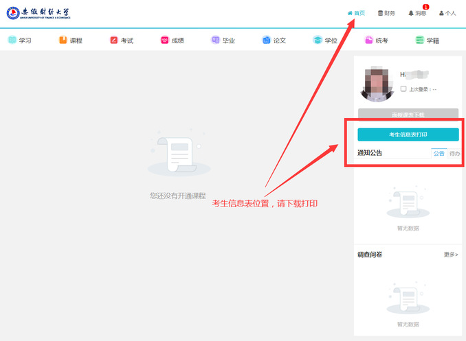 考生信息表打印办法:2022级新生先登录教务系统:http://acjjy.aufe.edu.cn/,登录用户名为个人学号,密码是身份证后六位。打印位置如图: