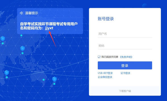 (1)考生登录 http://jjyxt.aufe.edu.cn网址后,通过账号密码进入考试平台(账号密码均为jjyxt),如下图所示: