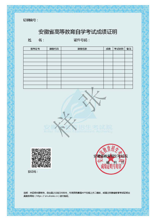 附件1:《安徽省高等教育自学考试成绩证明》样张