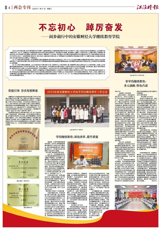 2025年1月21日《江淮时报》两会专刊以《不忘初心 踔厉奋发 阔步前行中的安徽财经大学继续教育学院》为题,整版专题报道了我校继续教育学院。