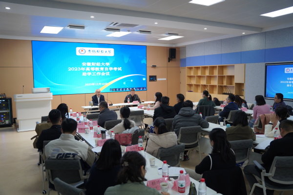 为推动我校高等教育自学考试事业健康发展,部署2024年自考助学各项工作,表彰2022~2023年度自考助学中心和先进个人,12月10日,安徽财经大学2023年高等教育自学助学工作会议在龙湖西校区顺利召开。来自22家自学考试学习服务中心的负责人和工作人员参加会议,继续教育学院院长王浩,副院长顾鸿和学院相关人员参加会议。会议由顾鸿主持。