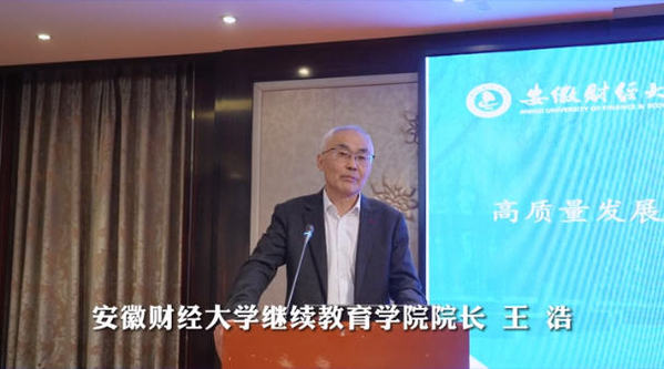 会上王浩分享了安徽财经大学学历继续教育高质量发展与数字化行动的做法与思考。提出新时代高等学历继续教育高质量发展“四优”策略建议,介绍了安徽财经大学实施高等继续教育数字化改革“1+3”模式,最后还分享了学校高等学历继续教育自2020年开始全面向数字化转型的线上教学督导的实践成功经验。