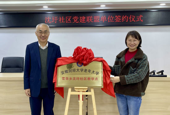 11月18日上午9时30分,安徽财经大学老年大学雪华乡沈圩社区教学点揭牌暨党建联盟签约仪式在蚌山区雪华乡沈圩社区举行。安徽财经大学继续教育学院院长、老年大学常务副校长、机关党委第十二党支部书记王浩,蚌山区雪华乡党委委员、副乡长孔德林,沈圩社区党支部书记唐传秀等出席仪式。参加仪式的还有沈圩社区教学点舞蹈班的社区居民学员们。