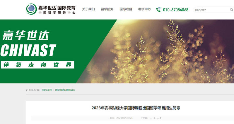 5月22日,中国(教育部)留学服务中心嘉华世达国际教育官网发布《安徽财经大学学校简介》《2023年安徽财经大学国际课程出国留学项目招生简章》