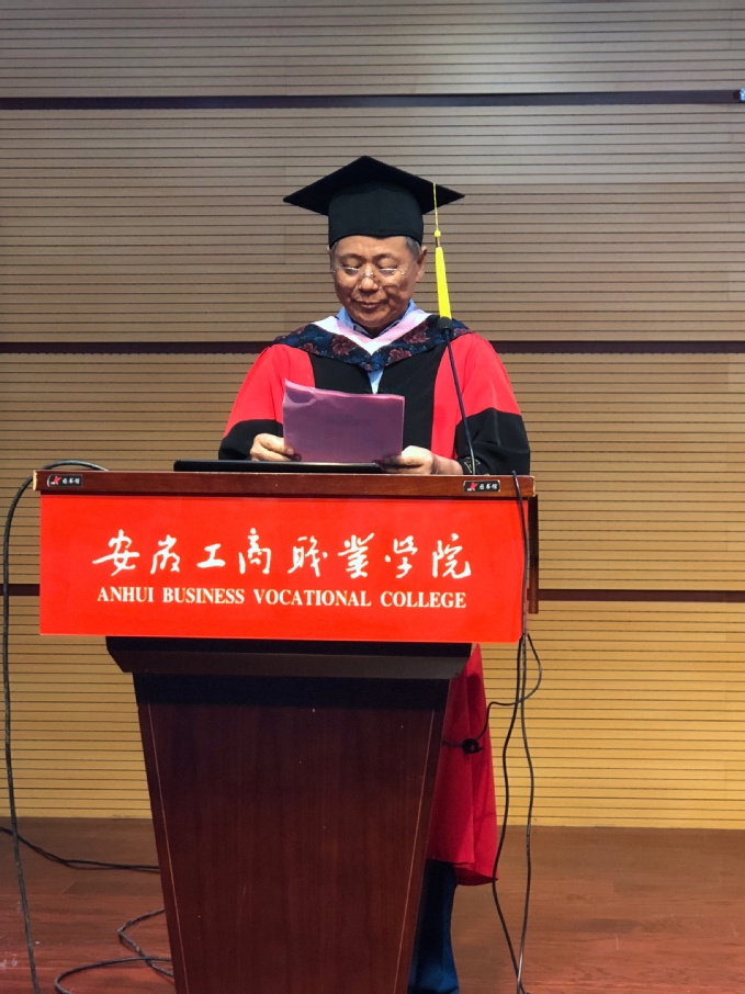 安徽工商职业学院党委副书记、校长李雪致辞。我校继续教育学院院长张治理宣读《关于授予2018届高等教育自学考试本科毕业生学士学位的决定》。安徽工商职业学院副校长汪贤武主持仪式。我校继续教育学院副院长曾娟,安徽工商职业学院会计学院院长高克智、继续教育学院院长王春珊出席。350余名师生参加仪式。程佳伟代表毕业生发言。